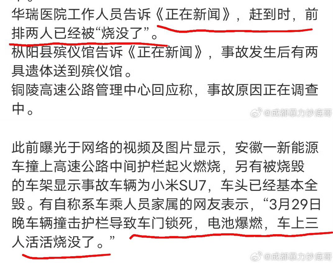 据媒体报道,记者赶到时,车子前排两人已经“烧没了”观察者网:有自称系车乘人员家属的网友表示,“3月29日晚,车辆撞击护栏导致车门锁死,电池爆燃,车上三人活活烧没了”