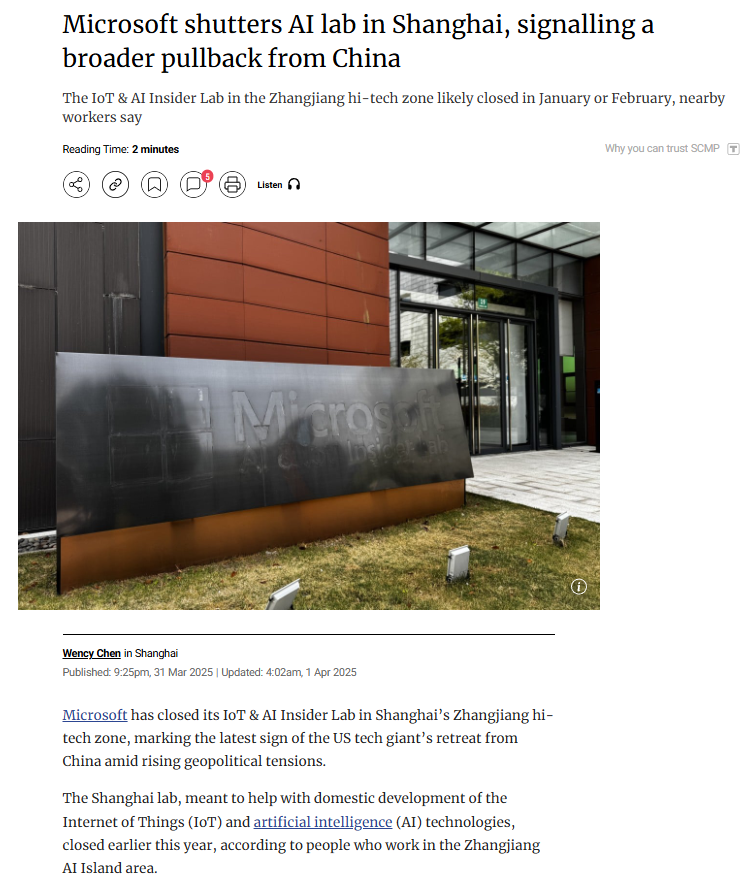 微软关闭了位于上海张江高科技园区的物联网与人工智能内部实验室,这是地缘政治紧张局势加剧背景下这家美国科技巨头撤出中国的最新迹象。