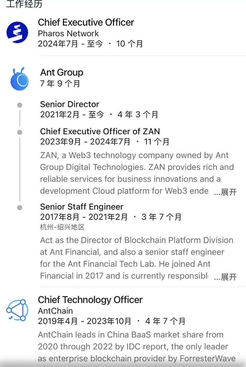 Pharos联合创始人兼CEO Alex Zhang曾担任蚂蚁区块链业务集团(拥有1000多名员工)的CTO,后来担任蚂蚁区块链品牌ZAN的CEO。