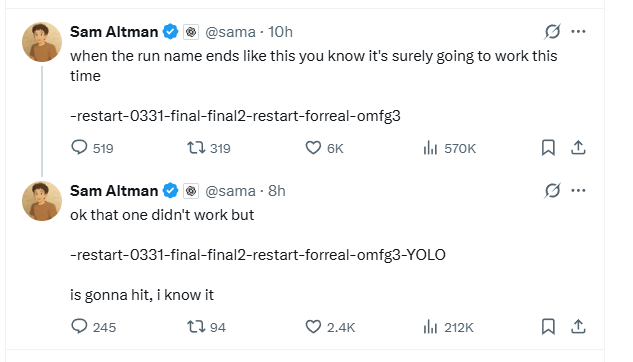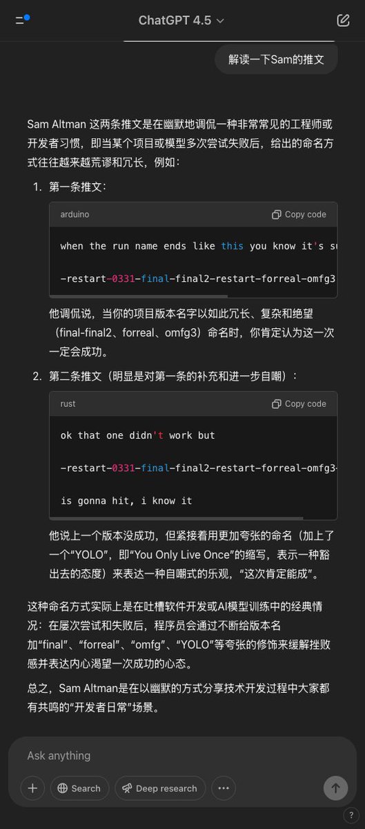 Sam Altman 这两条推文是在幽默地调侃一种非常常见的工程师或开发者习惯,即当某个项目或模型多次尝试失败后,给出的命名方式往往越来越荒谬和冗长,例如: