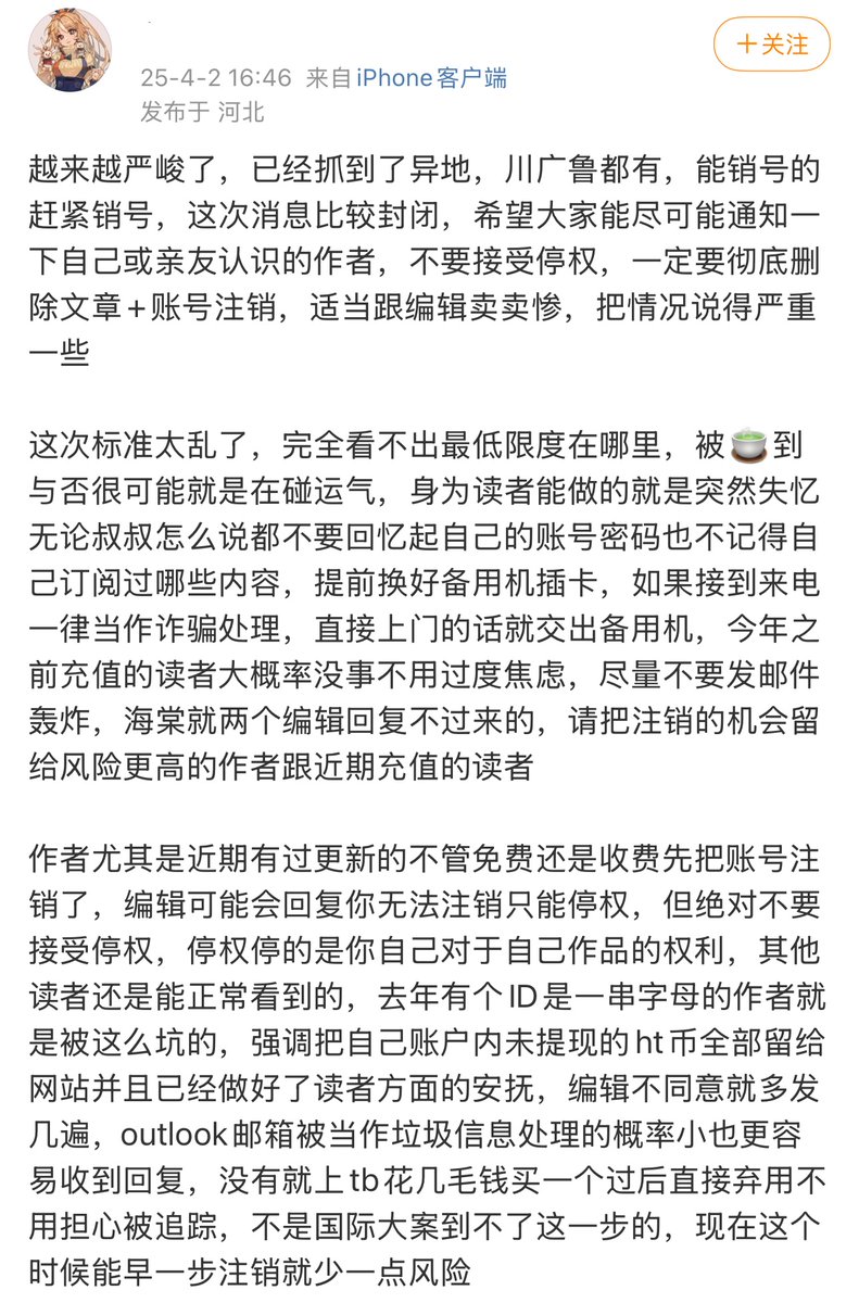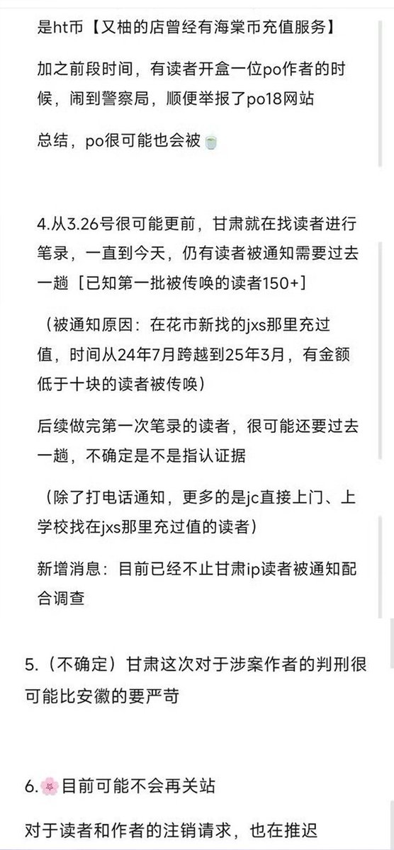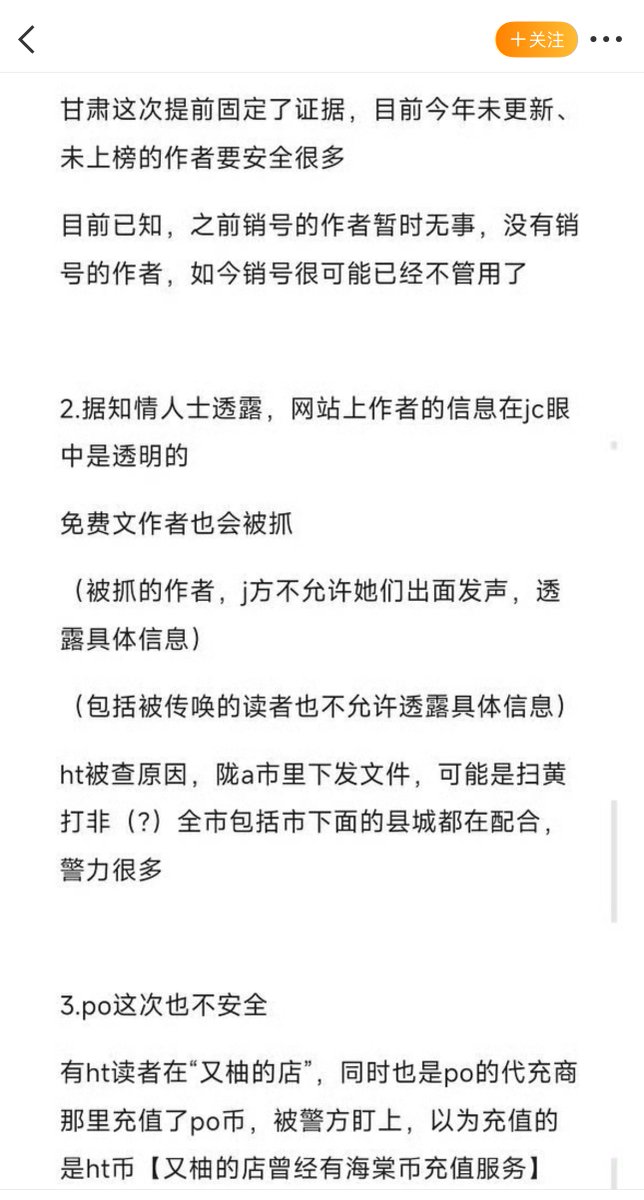 一位博主透露,在海棠文学上写免费文章的作者也会被抓,已知从3月26日开始,甘肃警方就在找读者做笔录“已知第一批被传唤的读者150+”“除了打电话通知,更多的警察上门,上学校找充值过的读者” 另一位网友透露:“越来越严峻了,已经抓到了异地,川广鲁都有”这名网友建议大家被喝茶时将提前准备好的备用机交给警察,面对警察审问就说不记得账号密码,不记得订阅过哪些内容。
