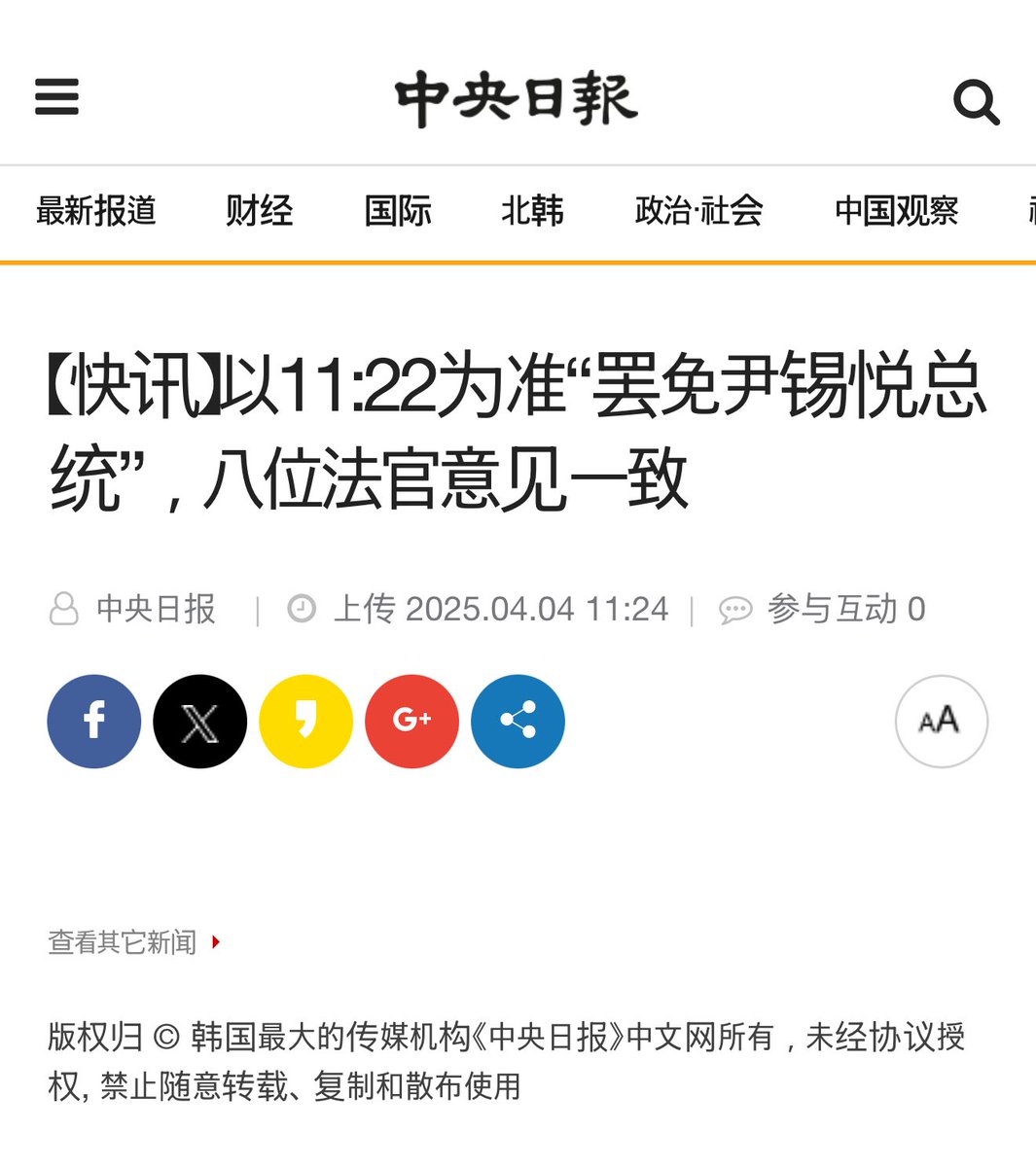 韩国法院一致通过了罢免尹锡悦正式被罢免