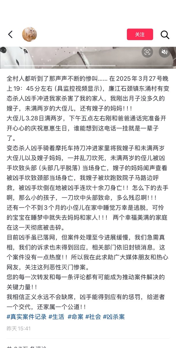 4月3日,广东廉江东涌村。女子称,3月27日晚,杀人凶手骑着摩托车持刀闯进家里,将嫂子和其两岁的孩子,以及嫂子的母亲一并乱刀砍死灭门。 虽然凶手落网,但案件进展缓慢,相关部门封锁消息,家属的诉求也未得到回应。