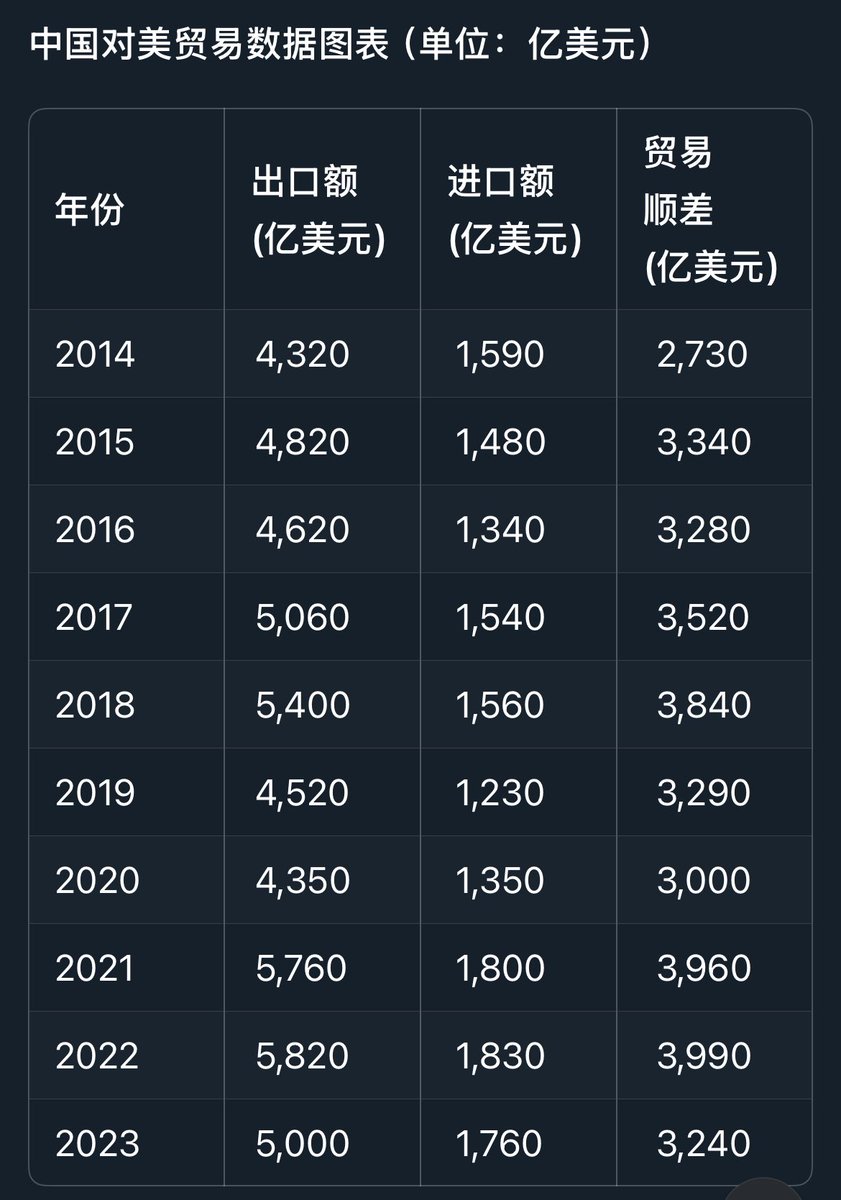 中国十年对美出口总额:49,672 亿美元对美进口总额:15,480 亿美元贸易顺差总额:34,192 亿美元