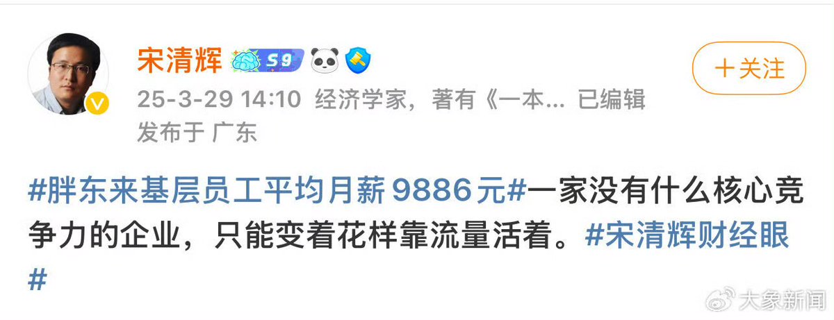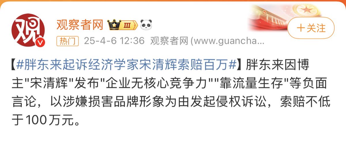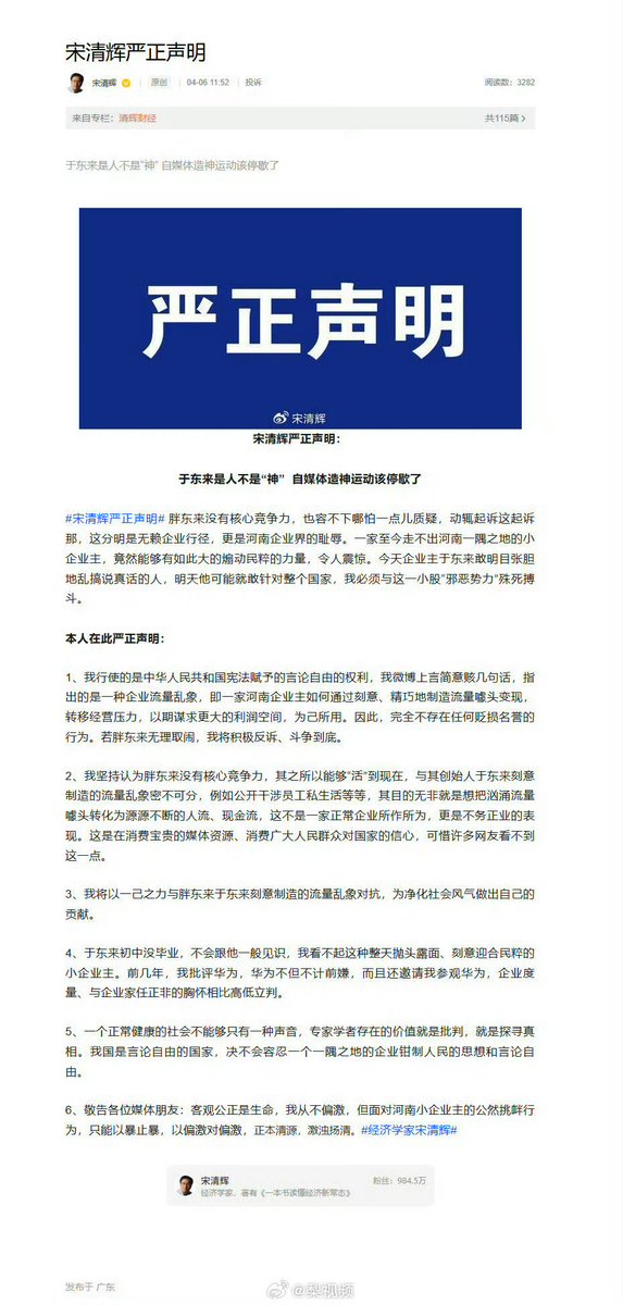 近日,中国经济学家宋清辉发微博评价胖东来:“一家没有什么核心竞争力的企业,只能变着花样靠流量活着” 4月5日,胖东来表示,该言论涉嫌对公司品牌形象进行贬损,将起诉宋清辉,追责金额不低于100万。 宋清辉回击:死磕到底!一个正常健康的社会不能只有一种声音,我国是言论自由国家,绝不会容忍一个一隅之地的企业钳制人民思想和言论自由。