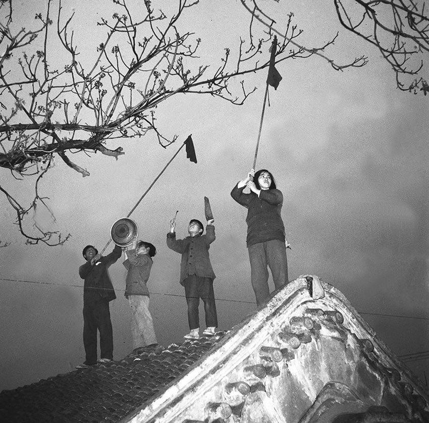1958年4月19日,北京大规模全面围剿“四害”之一的麻雀。另三害是苍蝇、蚊子、老鼠,麻雀是益鸟,当年被“冤枉”了,后来逐渐被“平反”,而先后以臭虫、蟑螂代替。这是北京市民在夜间上房顶轰赶麻雀(新华社稿)