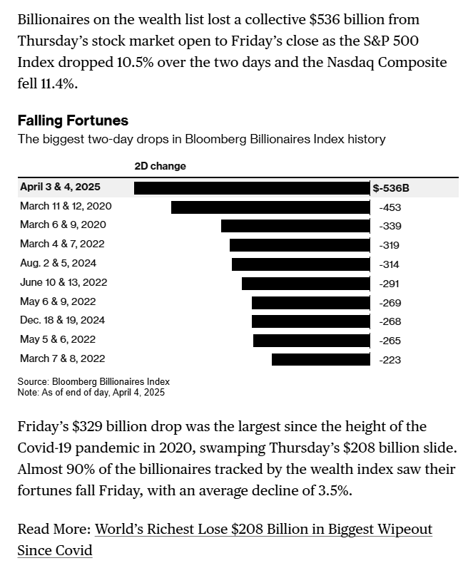 美国总统特朗普的新关税措施引发股市大震荡,彭博4月5日报道,全球500首富遭遇历来最大损失,总财富在两天内蒸发超过5000亿美元。其中特斯拉首席执行官马斯克这两天损失最大,由于特斯拉股价在周五暴跌超过10%,他的净资产缩水了310亿美元,使他今年以来的损失扩大至1300亿美元。