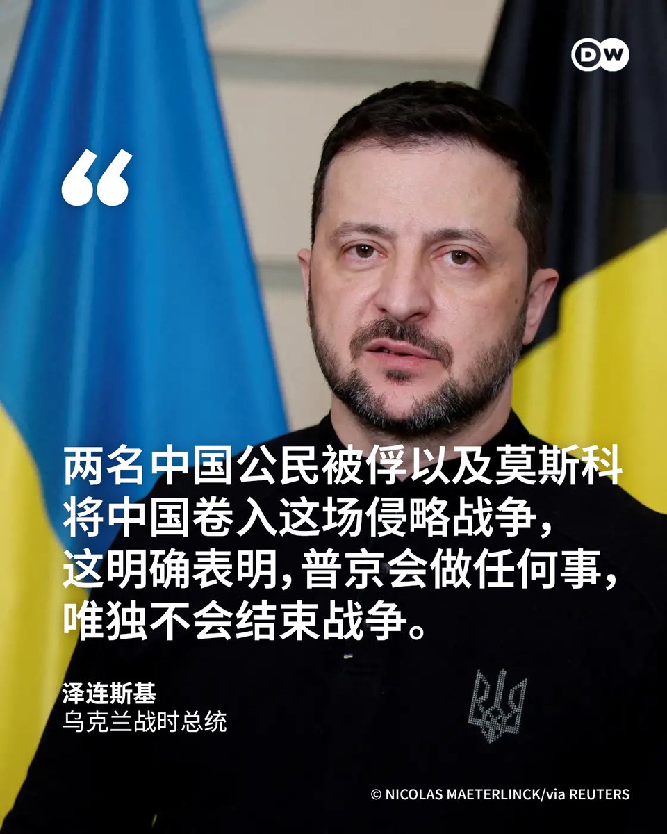 乌克兰总统泽连斯基表示,有证据显示,同俄军并肩战斗的“还有更多的中国公民”。泽连斯基称:“我已指示乌克兰外交部长立即与北京取得联系,了解中国对此事态的回应。”这位乌克兰领导人表示,上述两名中国公民被俘以及莫斯科将中国卷入这场侵略战争,是“一个明确的信号,表明普京会做任何事,唯独不会结束战争”。
