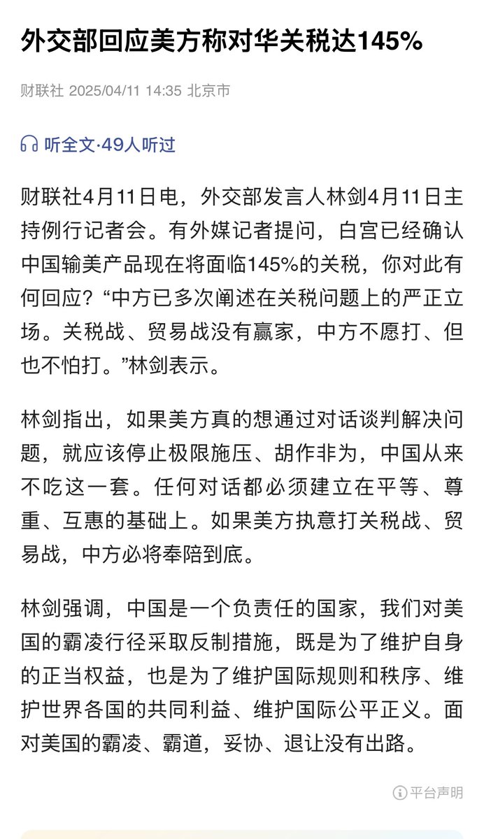 习近平:中国无畏惧任何无理打压,无论外部环境如何变化,中国都将坚定信心、保持定力,集中精力办好自己的事。 外交部回应美方称对华关税达145%:关税战、贸易战没有赢家,中方不愿打、但也不怕打,如果执意要打,中方必将奉陪到底。