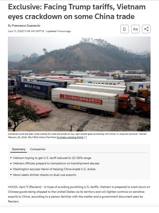 路透社:为了避免美国的惩罚性关税,越南将准备打击转运往美国的中国商品,,并加强对向中国出口的敏感产品管制。此前,白宫贸易顾问纳瓦罗等官员曾警告中国向美国出口贴有「越南制造」的标签,以享受较低的关税。