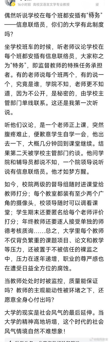 网友分享:细思极恐!高校在每个班里都安插用来监督教师的特殊任务承担者——信息联络员?博主最后的一段话发人深省:大学的现实是社会风气的最后延伸,当大学的精神高地坍塌,这个时代的社会风气情景自然不难想象。