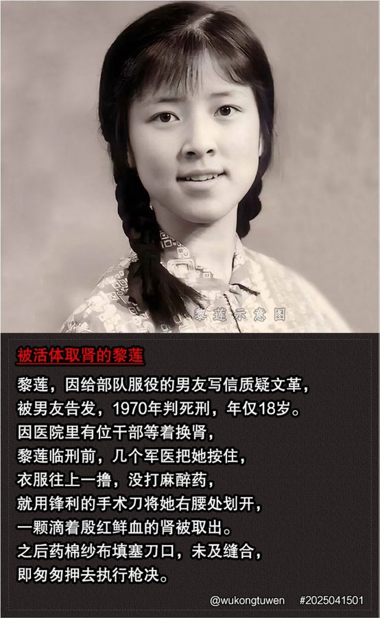 共匪上世纪70年代就对异见人士进行器官活摘了,而且是一个刚刚十八岁的青年女子!经过几十年的发展,共匪已经建立了一套技术成熟、杀人不见尸的移植体系,主要的受害者除了法轮功学员就是来自失踪找不回来或者忽然莫名奇妙死亡的青少年。