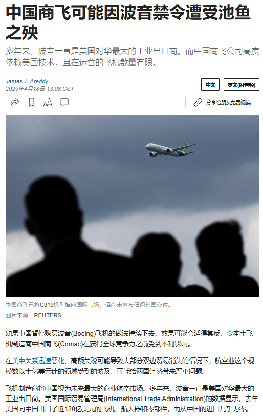 WSJ:中国当局已告知国内航空公司暂停订购新的波音飞机,美国银行(Bank of America)分析师Ronald J. Epstein在报告中指出:与许多其他行业不同,商用航空航太业并没有依赖中国低成本制造” “如果中国停止从美国购买飞机零部件,C919项目将陷入停滞,甚至终结” 数据显示,去年美国向中国出口了近120亿美元的飞机、航天器和零部件,而从中国进口这类产品的金额几乎为零,中国C919之所以适航,也是因为采用了美国公司的关键技术。