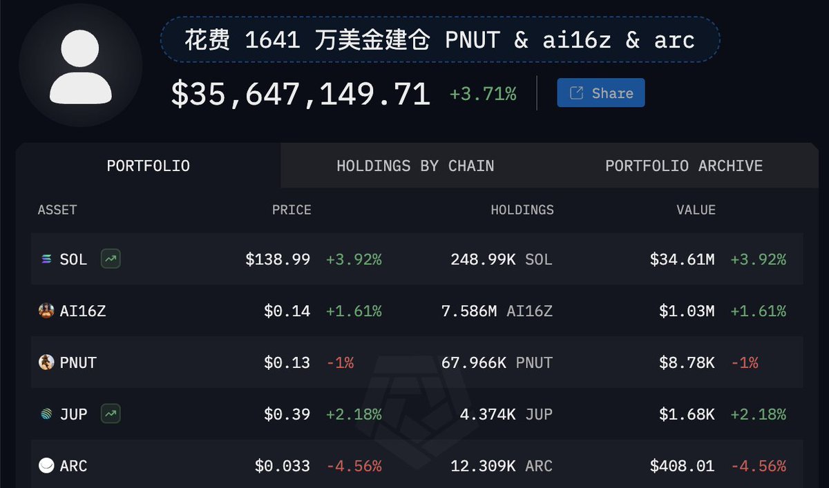 短短五个月时间,「曾花费 1641 万美金建仓 $PNUT & $ai16z & $arc 的巨鲸」已累计亏损 998 万美元,资产缩水超 60%🥲