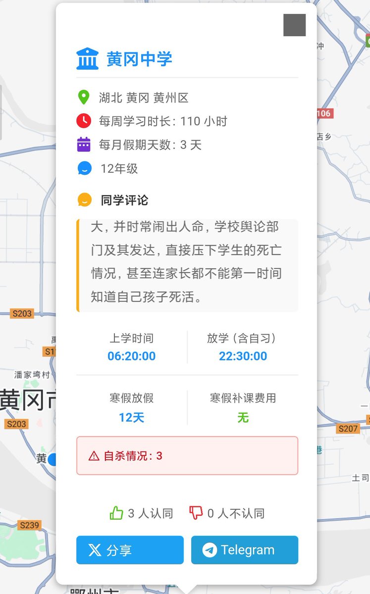 学生投稿黄冈几乎所有的高中都是放月假,一个月休1~4天不等。黄冈的高中普遍都是执行朝6晚10,放月假的制度,哪怕是生源不好的学校也是的。学生称,仅在去年,黄冈中学就有三名学生自杀。
