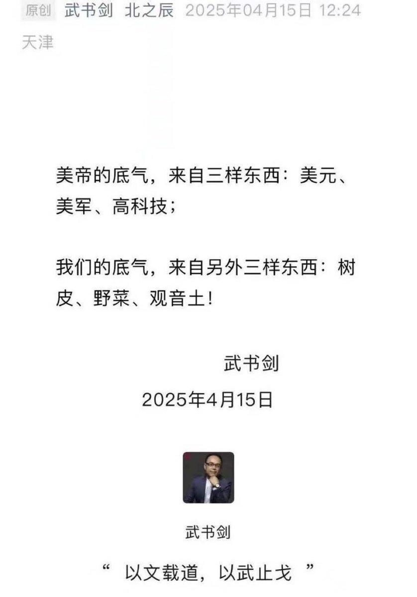 4月15日,博主“武书剑”发文:美帝的底气,来自三样东西:美元、美军、高科技; 我们的底气,来自另外三样东西:树皮、野菜、观音土!