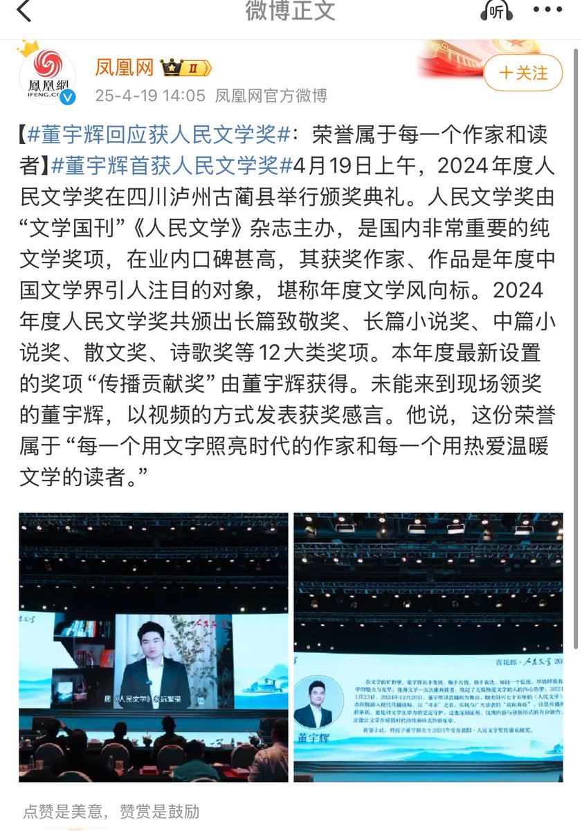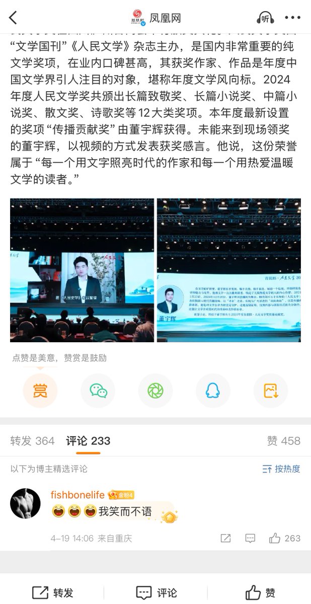 昨天,2024年度“人民文学奖”在四川泸州古蔺举行颁奖典礼,其中“传播贡献奖”颁给了董宇辉, 有意思的是,凤凰网从两百多条评论中,精选了一条“我笑而不语”的评论,疑似回应董宇辉获奖。