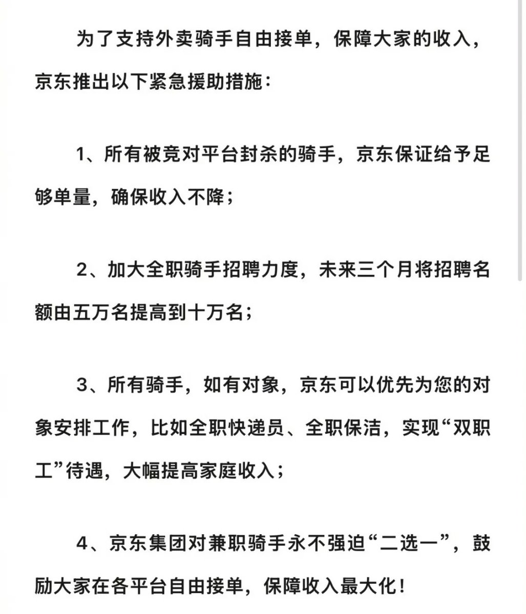 京东还在信中鼓励大家在各平台自由接单,保障收入最大化,承诺永远不会对简直骑手强迫“二选一”。