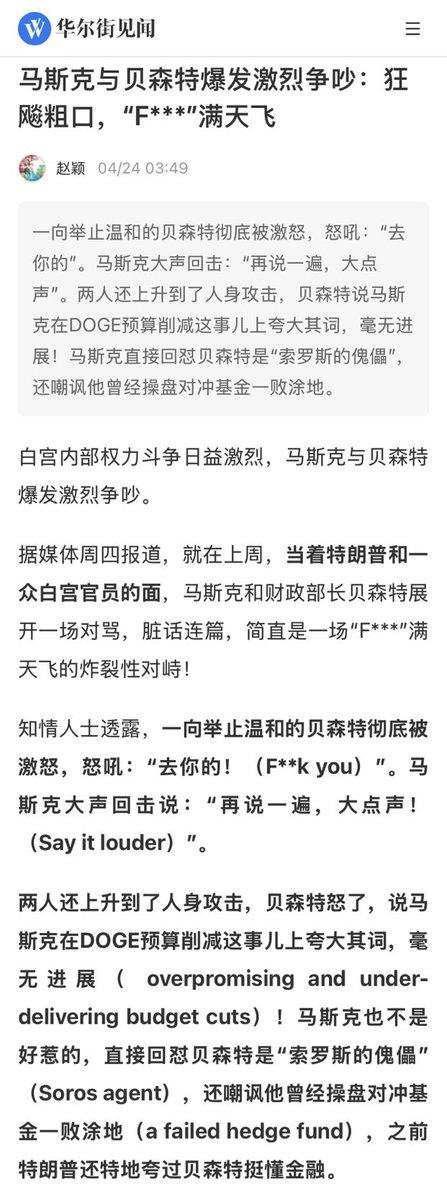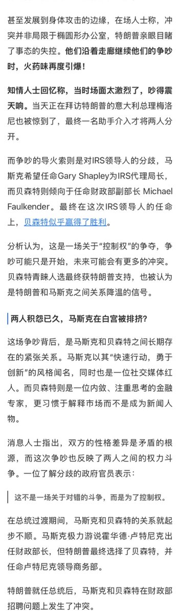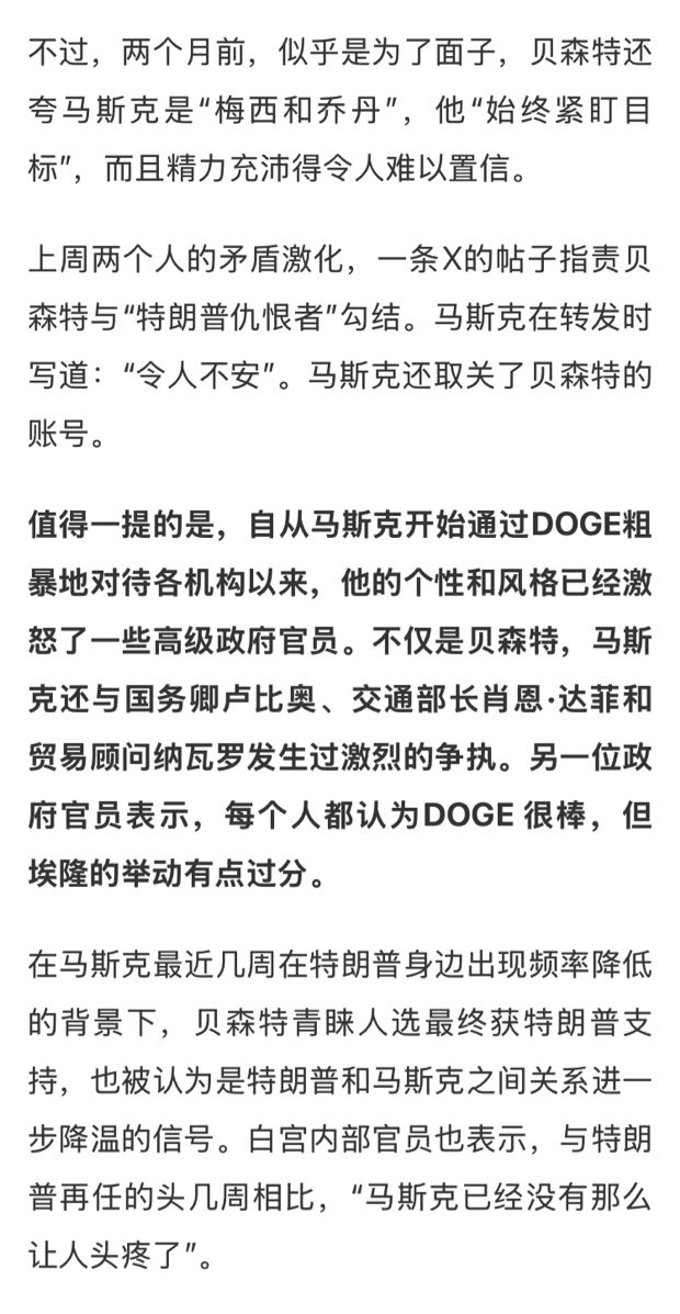 马斯克与美国财政部长贝森特爆发激烈言语冲突差点儿在白宫当着一众官员的面打起来,把当时正在白宫访问的意大利总理梅洛尼惊呆了,被疑是两人权力斗争白热化。此前,马斯克与国务卿卢比奥、交通部长达菲、毛衣顾问纳瓦罗等高级别官员之间也发生过激烈冲突。 虽然一直不喜欢马斯克,但他确实是难得一见的科技奇才,不过他也确实缺少政治智慧,看到他这样受人排挤,即使作为他的反对者也会觉得很惋惜。