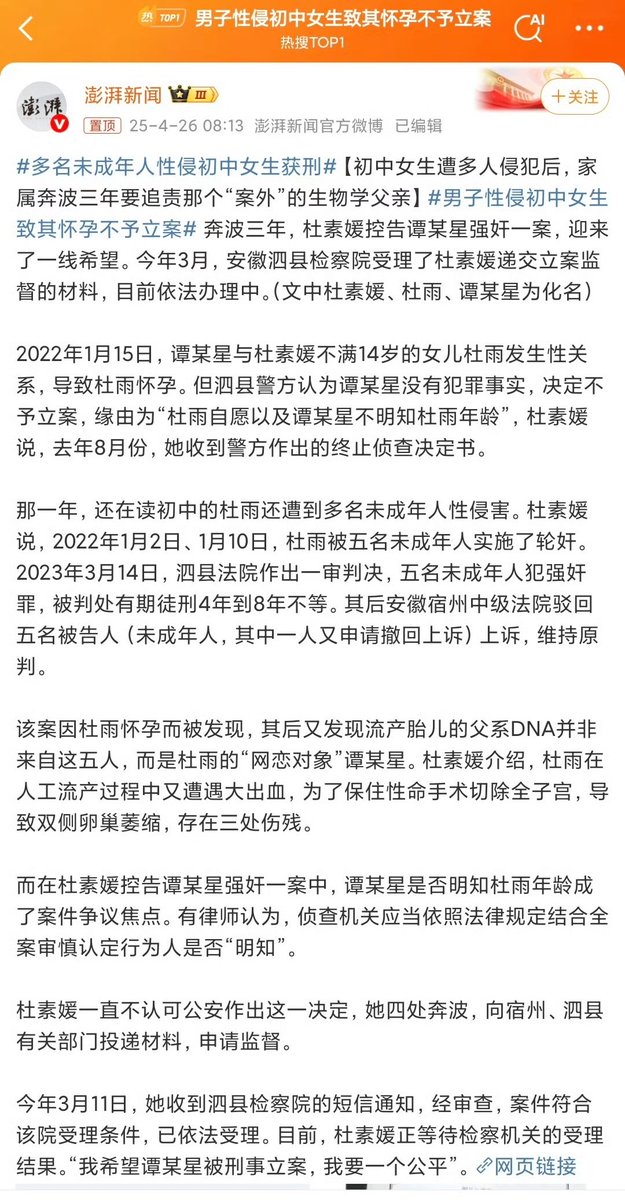 2022年不满14岁的女生杜雨被五名未成年人轮奸,23年安徽泗县法院判决五名未成年人犯强奸罪,被判4年-8年不等。杜雨怀孕流产发现胎儿父系DNA并非来自这五人,而是网恋对象谭某,并且杜雨在流产中遭到大出血,为了保命切除了全子宫导致双侧卵巢萎缩。家属控告谭某强奸,但泗县警方认为女生是自愿,以及谭