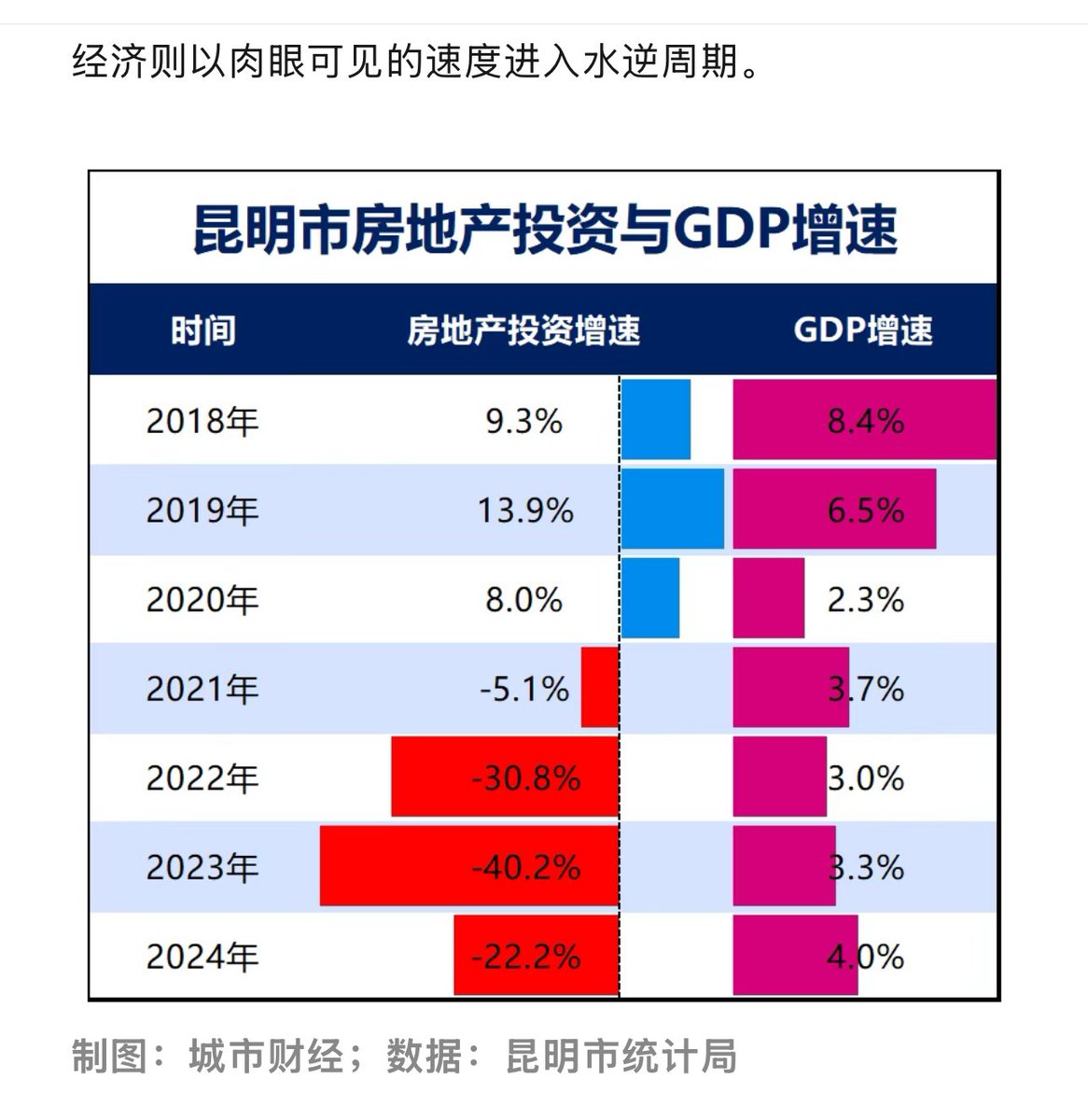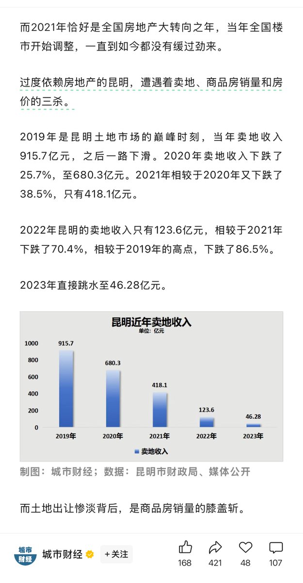 公众号“城市财经”:云南昆明2019年卖地收入915亿元,之后一路下滑,2023年直接跳水至46亿元。而土地出让惨淡背后,是商品房销量的膝盖斩。2023年昆明商品房销量749.4万平方米,相比2019年的1916.23万平方米的高点,下跌了60.9%,此外,由于昆明过度依赖房地产,经济也以肉眼可见的速度进入水逆周期。