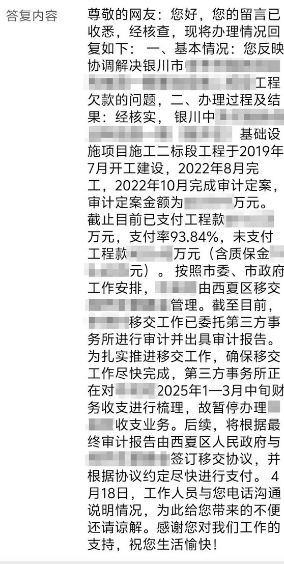 值得注意的是,错误答复的工程欠款问题的涉事项目疑似政府招标项目,于2022年8月完工,工程款仍未被全额支付。回复中称根据市委市政府安排,项目款的支付由西夏区政府移交给一个第三方管理。