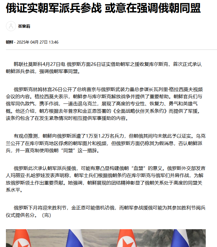【俄官方首次证实朝鲜军队参与俄乌战争】韩联社报道,俄罗斯武装部队总参谋长格拉西莫夫在向俄总统普京汇报时,对朝鲜军人表示赞扬。这是俄官方首次证实朝鲜军队参与俄乌战争。俄罗斯外交部发言人玛丽亚·扎哈罗娃发表声明称,朝军士兵们根据俄朝条约在库尔斯克与俄军们并肩作战,为解放俄罗斯领土作出重要贡献。她强调,朝鲜展现的团结精神彰显了俄朝关系处于高度的同盟关系水平。