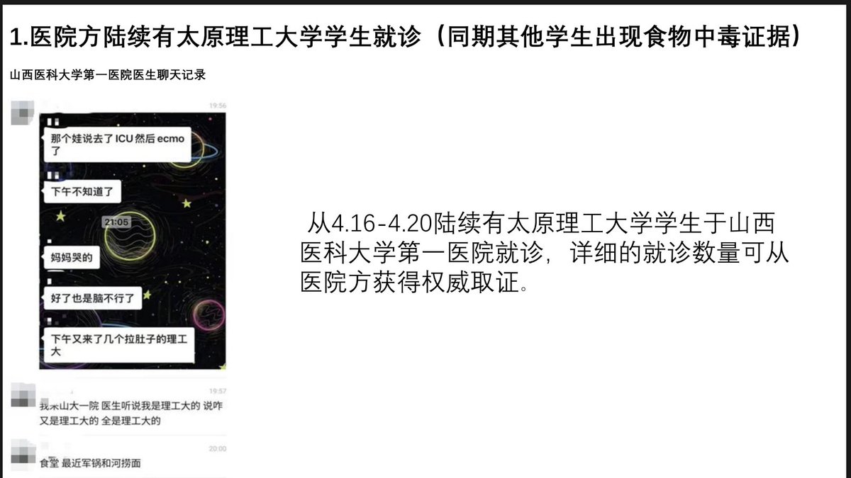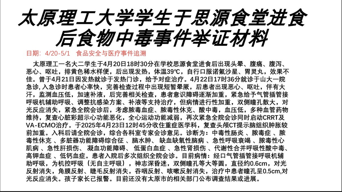 学生投稿4月20日,太原理工大学一学生发生中毒性急性肠胃炎,合并、脓毒症 、多脏器功能障碍综合征 、脑水肿等严重症状,生命垂危。同时,还陆续有其他学生就医,高度怀疑学校食堂爆发严重食物中毒事件。目前,有学生已经整理了一份30多页的PDF证据文件作为备份。