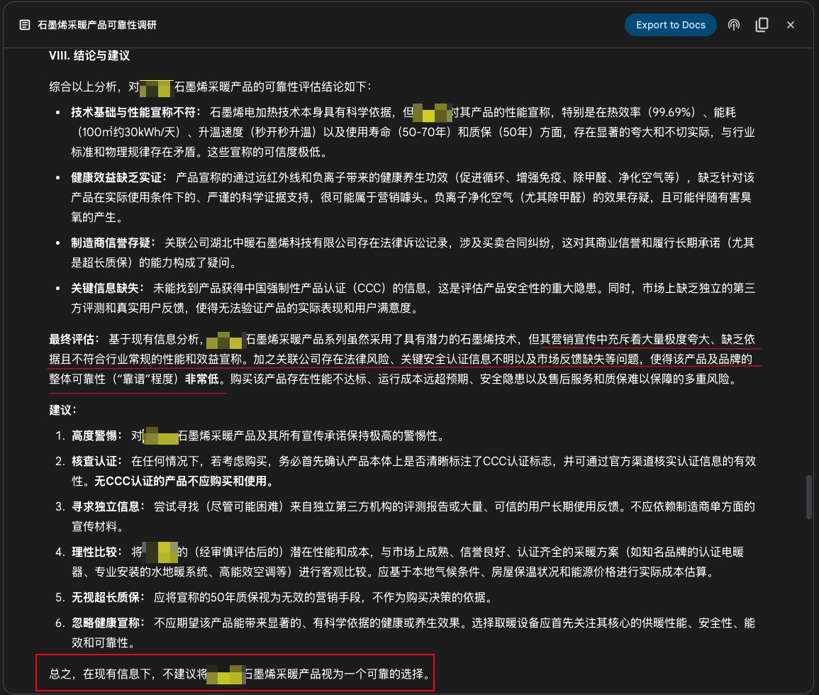 Deep Research 一个很好的应用案例,看产品的广告是否靠谱,是否虚假宣传。