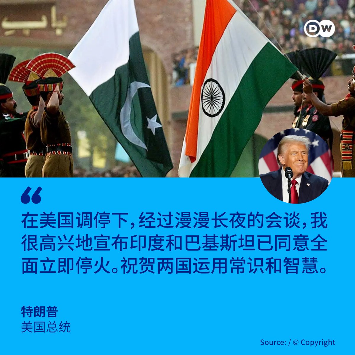 据美联社报道,印度和巴基斯坦周六在美国斡旋下达成停火协议。此前美国总统特朗普在自己的社交平台Truth Social上发帖宣布,印巴双方同意停火,并表示“祝贺两国运用常识和智慧”。在美国斡旋后,印度和巴基斯坦确认了停火协议。