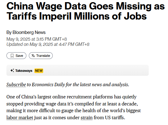 彭博报道,在线招聘平台之一的智联招聘,已连续两个季度没有发布其追踪全国38个主要城市新入职员工平均工资的报告。按往年惯例,该平台通常会在季度结束后的一个月内公布相关数据。这项数据没有如期发布,反映出中国近年来在统计数据披露方面日益收紧的趋势。令分析师和投资者难以掌握一个日益敏感的现