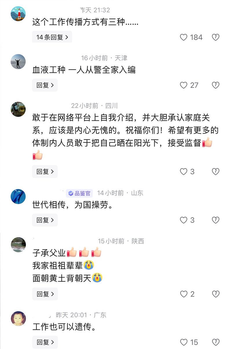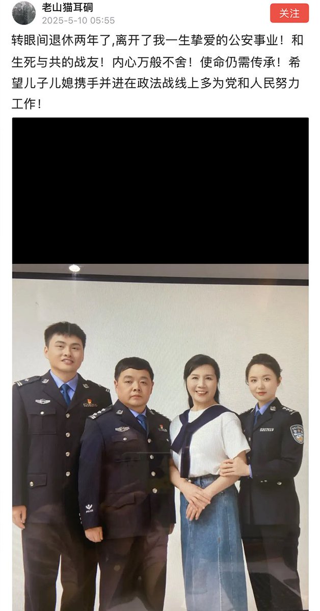 5月10日,贵州。一名退休警察发文称,“转眼退休两年了,使命仍需传承!希望儿子儿媳携手并进,在政法战线上多为党和人民努力工作!”他还晒出了自己和儿子儿媳穿警服的合照。该贴遭到大众质疑:“这是门阀世家”“呼唤黄巢,黄巢专门结束这种门阀” 不过也有网友表示,既然别人敢公开发出来说明没有问题