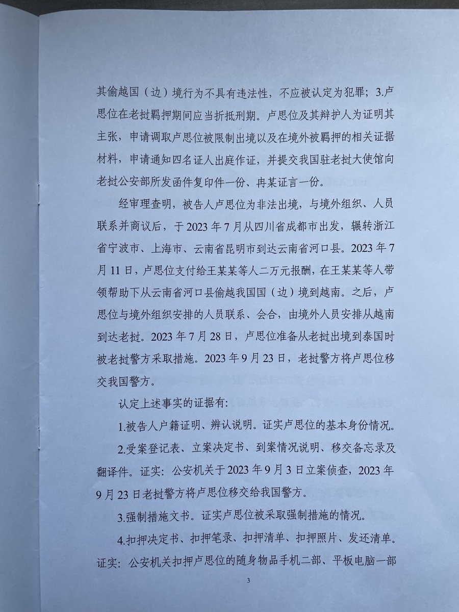 一审判决书所列证据的第七项,媒体采访内容,是其在老挝被挡之后家人求助,判决书掐头去尾故意误导表述成“请其帮助卢思位从中国出境”,此与事实严重不符;第十一项证据中,判决书所称的“‘傅牧师’说如果出了中国国境可以想办法安排其去妻女所在国”,不符合事实,不是其笔录的原话,一审判决书篡改了他的笔录。