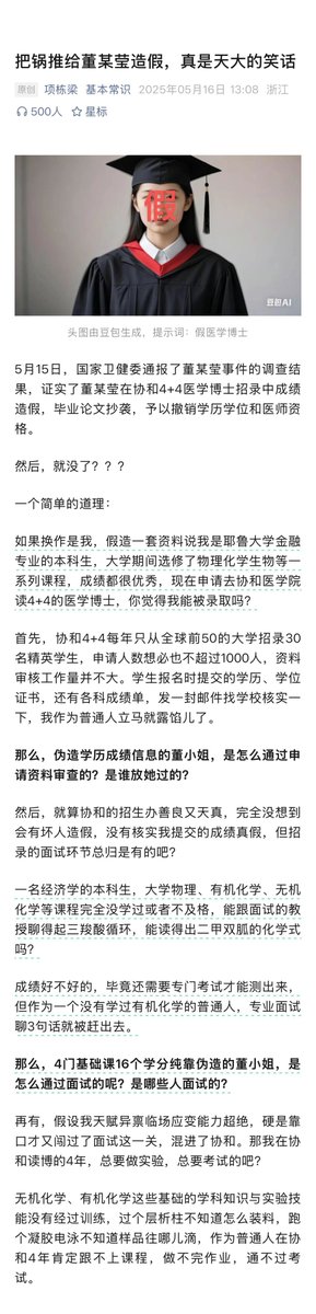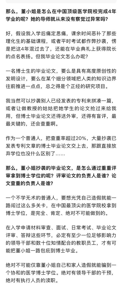 国家卫建委:协和董袭莹入学资格造假、还存在抄袭剽窃等学术不端行为,撤销董袭莹四项证书。媒体人项栋梁对此提出质疑:协和医学院只需要向学校发一封邮件,便能核实董袭莹报名时提交的学历、学位证书,还有成绩单。那么伪造学历成绩信息的董袭莹,入学协和医学院时是怎么通过资料审查的?是谁放过她的
