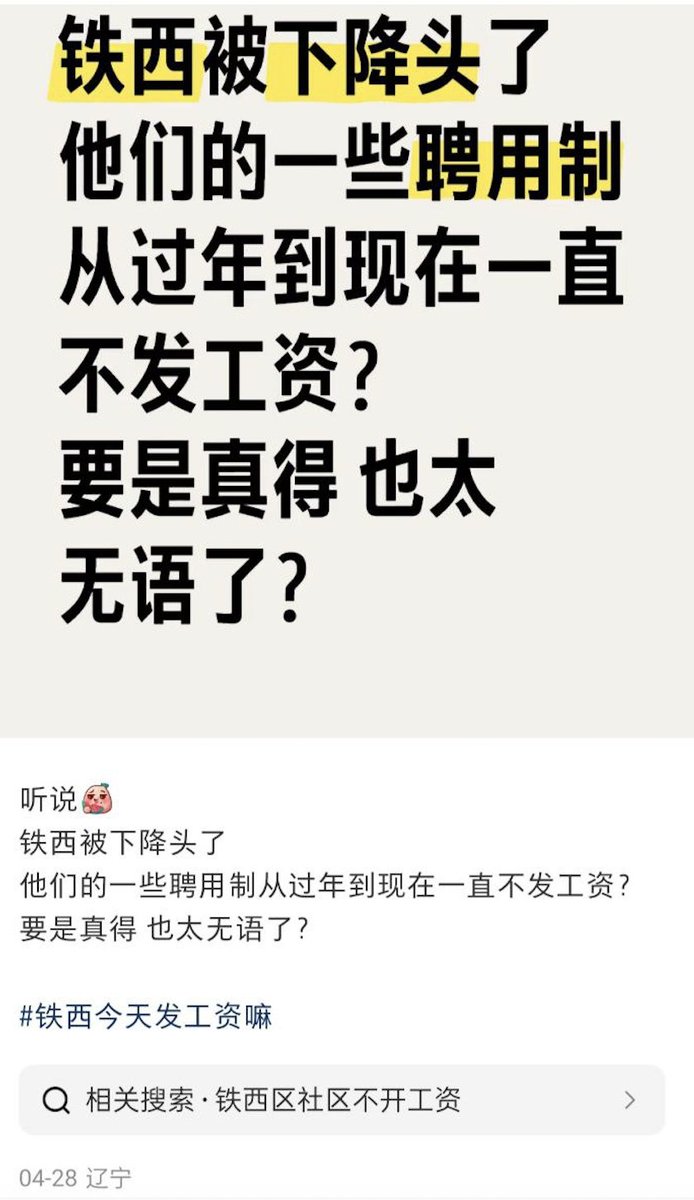 辽宁网友透露,沈阳市铁西区聘用制从过年开始一直欠薪。“活派遣工在干,工资在职的在发。”