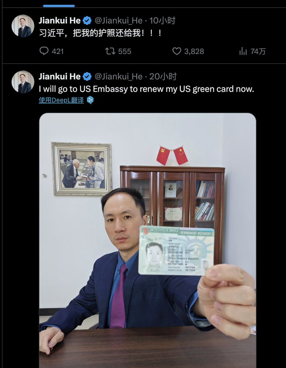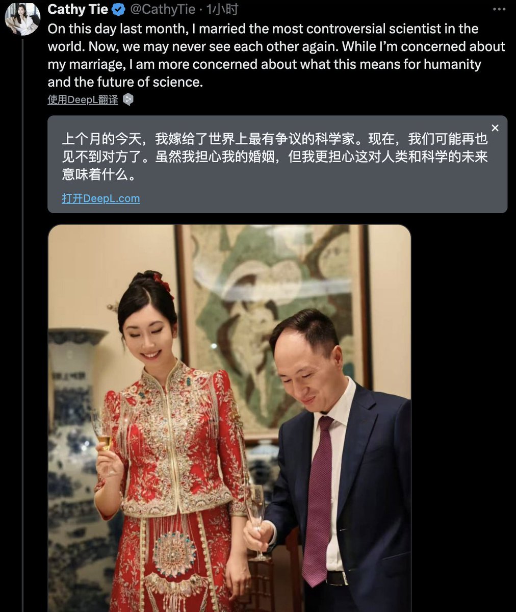 5月19日,中国生物学家贺建奎其妻子Cathy Tie
