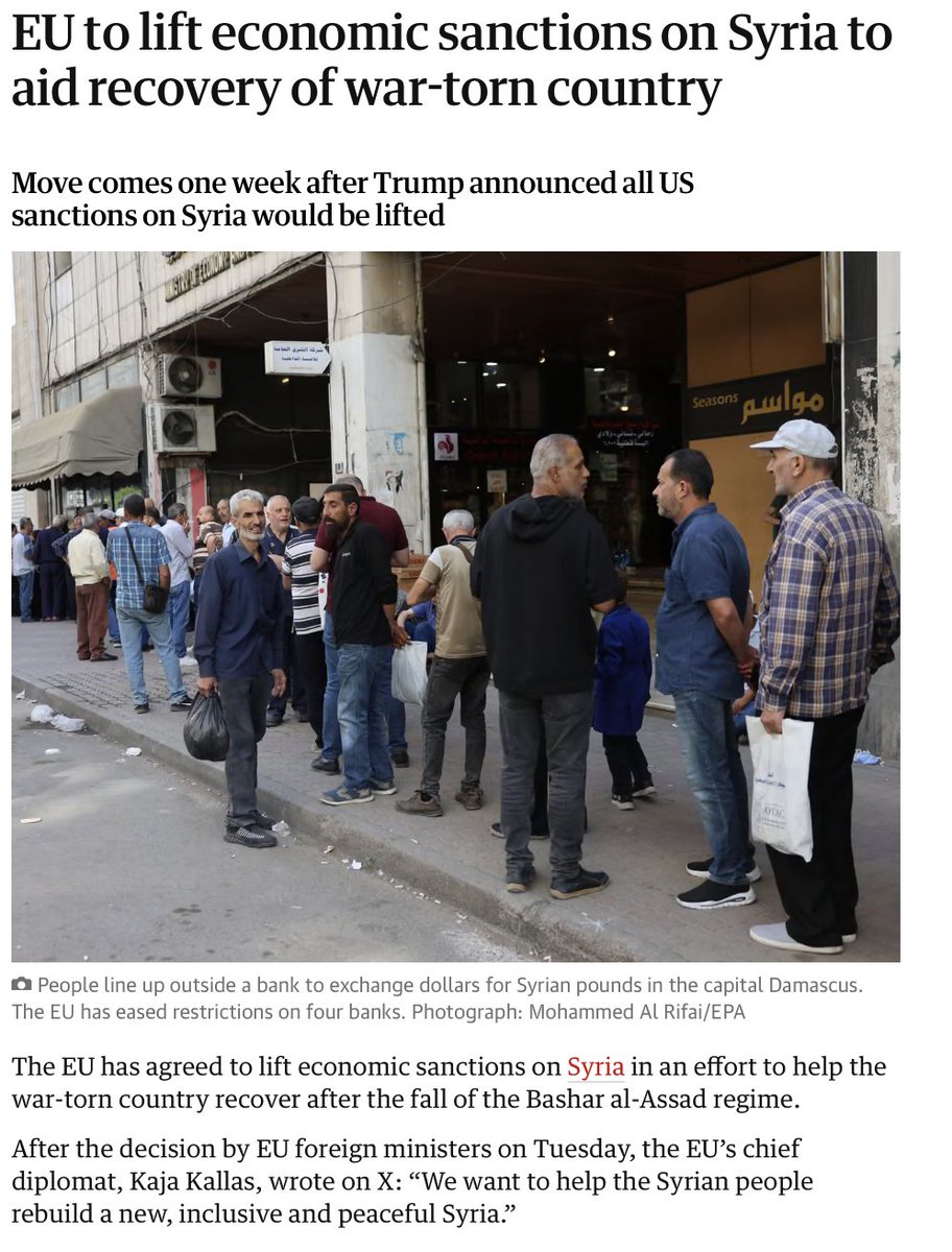 据路透社报道:在美国之后,欧盟也宣布解除对叙利亚政府的制裁,以帮助叙利亚在独裁者阿萨德政权倒台后从多年战争中恢复。