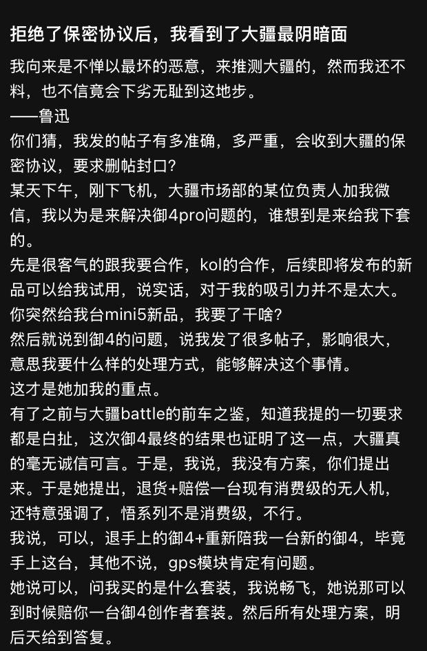 但当达成协议,大疆公关将保密协议发来后又只字不提退货和赔偿的承诺。博主质问退货和赔偿承诺后,大疆工作人员称机器的问题,归售后部门,他这里是市场部,只负责kol。