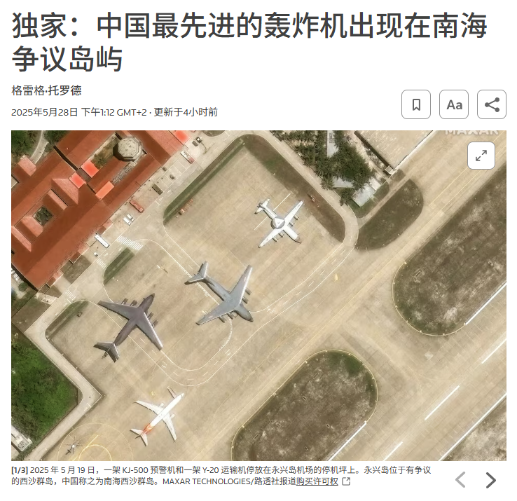 5月28日,路透社报道,卫星图像显示,中国本月在南海有争议的西沙群岛部署了两架最先进的轰炸机“轰6”。此次部署标志着远程轰-6轰炸机自 2020 年以来首次降落在西沙群岛永兴岛。