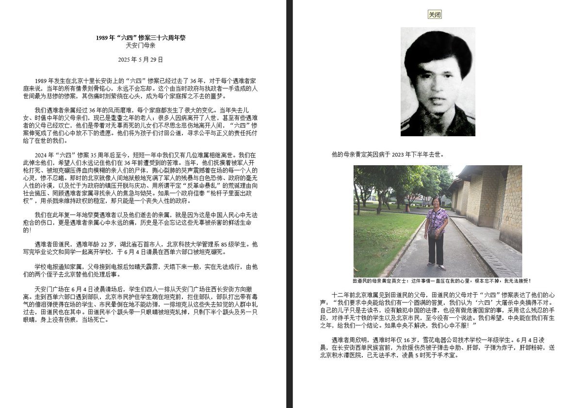 “六四”惨案已经过去了36年,为了让所有无辜被打死的遇难者得到公平公正,我们遇难者亲属坚守了36年。这一惨案不仅是压在我们难属的心里,也是压在全国人民心里不同寻常的一个重大历史事件,其严重性不是每个个人或者任何党派就可以定性,甚至在全国范围内被刻意掩盖、被边缘化,而是应该摆在人民面前,让人民知道真相,必须通过法律来解决的历史问题。