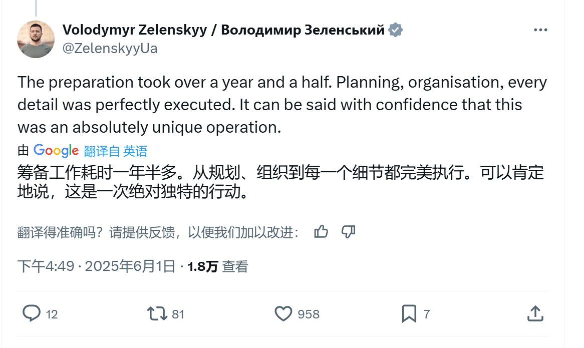泽连斯基表示,此次对于俄罗斯的袭击策划超过了1年半整个行动的细节和执行都非常完美
