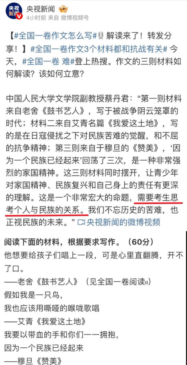 6月7日,高考全国一卷作文题目出炉,引用老舍,艾青,穆旦在抗日战争时期的文章,让考生思考个人与民族之间的关系和对家国精神的理解然而讽刺的是,老舍,艾青,穆旦三人均在建国后遭受了严重迫害,文革期间老舍自杀,穆旦被定性为“美国特务嫌疑”住进牛棚,艾青经历反右文革,最后儿子艾未未流亡海外