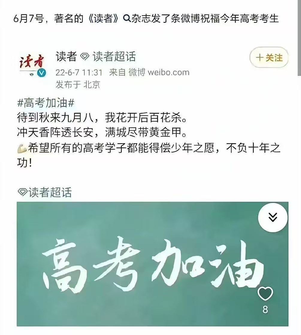 没文化有多可怕?《读者》难道没文化?中国高考期间,《读者》杂志发了下面的微博“祝福”今年高考学子。这首诗是历史上著名“反诗”,题为《不第后赋菊》,是黄巢科举落榜愤而写下的,诗句中杀气扑面而来。随后黄巢发动大规模暴动。《读者》此刻发这首诗,啥意思?