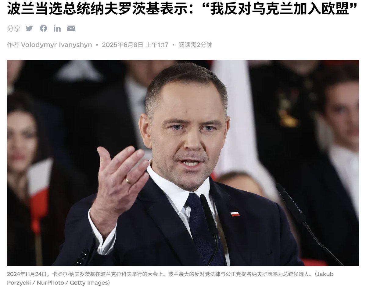 波兰新当选总统卡罗尔·纳夫罗茨基在 6 月 7 日发布的采访中接受匈牙利媒体 Mandiner 采访时表示:“目前,我反对乌克兰加入欧盟。”6月1日,保守派候选人纳夫罗茨基以50.89%的得票率赢得波兰总统选举第二轮投票。尽管他支持乌克兰的主权,但他曾表示反对乌克兰加入欧盟和北约。