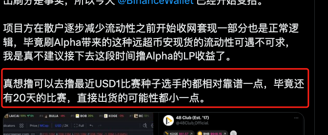从项目方的角度,让价格跌下去一点,也方便做大池子,更好的刷交易量。从项目方的角度想想,除非已经觉得赢得比赛无望,否则不太可能直接撤池子下刀,这也是我上次说与其撸zkj/koge 两个币的LP不如撸USD1大赛种子选手的原因。