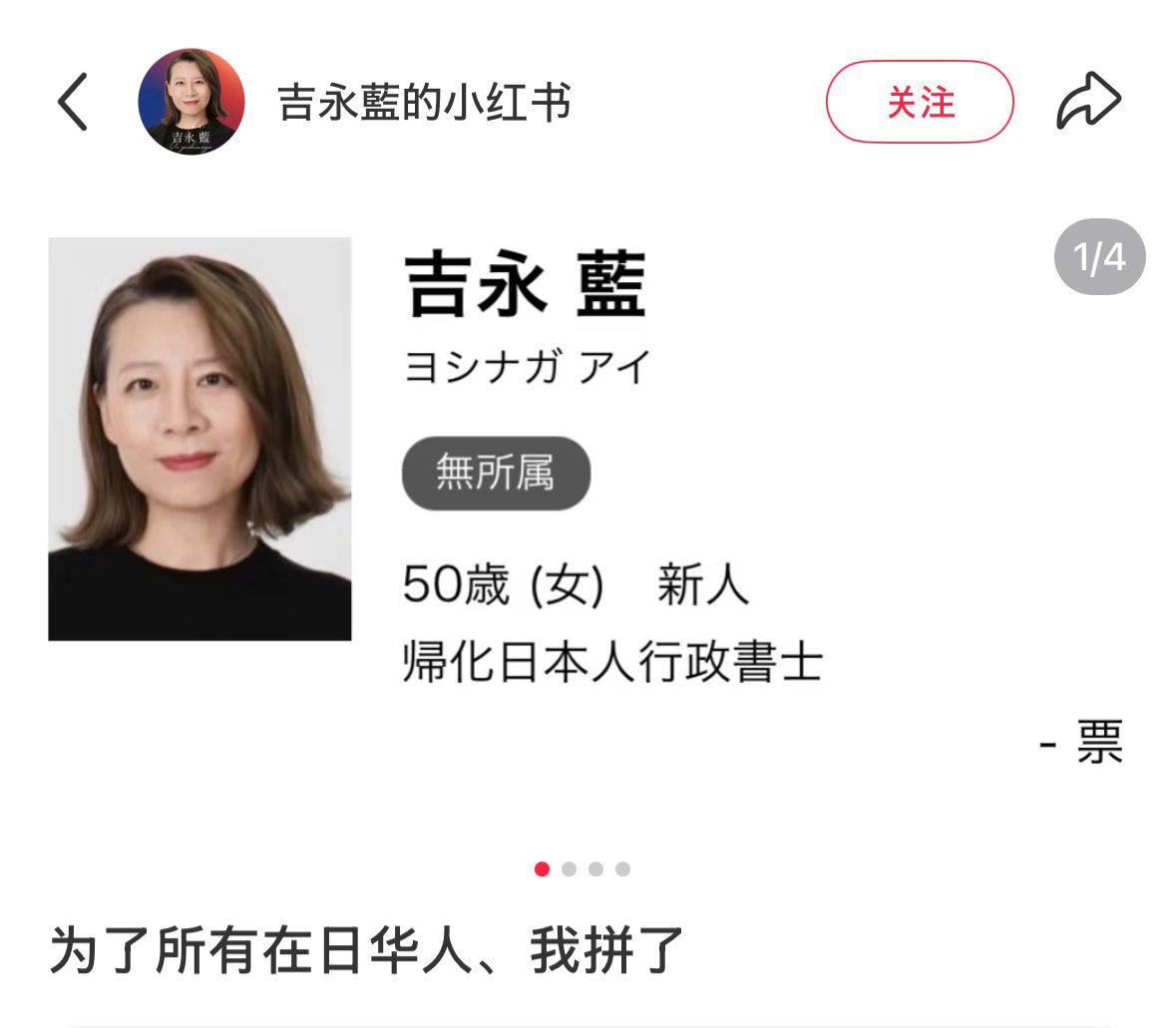 入籍日本的华人吉永蓝 @aiaiyoshinaga,近日竞选日本议员,在日本的竞选海报上承诺「为日本人服务」;转头去了小红书就讨好中国人,喊出「为了在日华人,我拼了」。