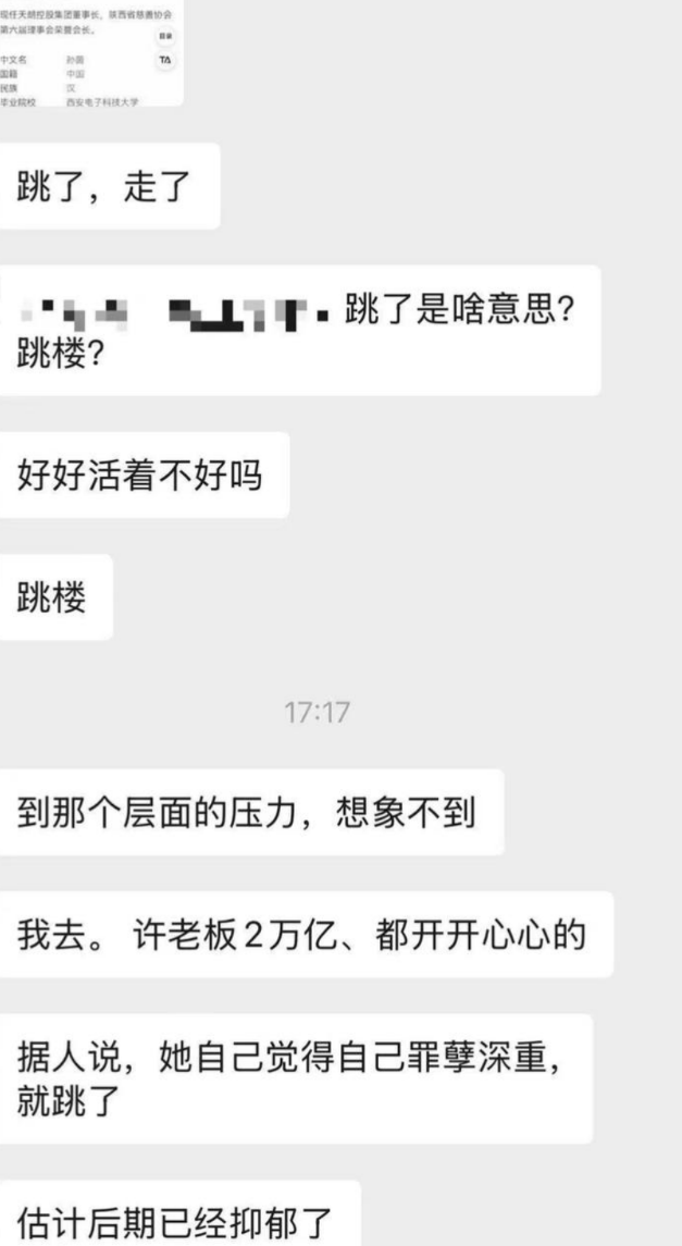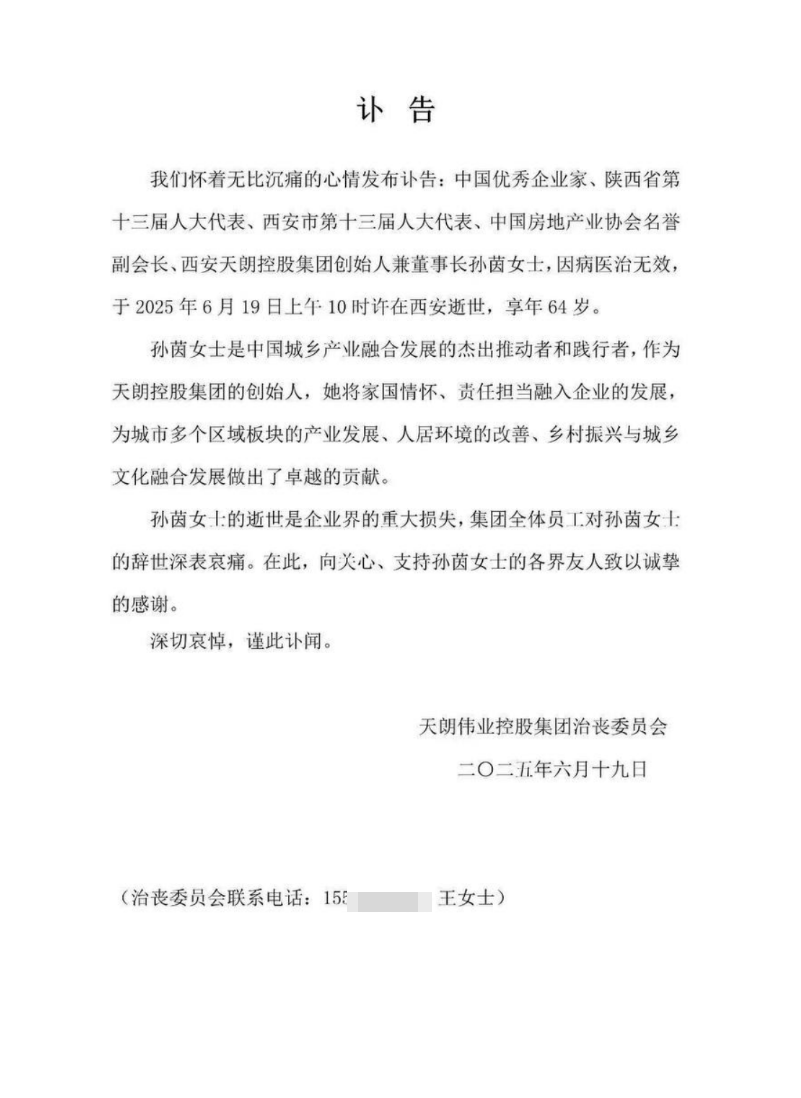 6月19日,陕西西安。天朗集团发布讣告,称董事长孙茵因病去世。天朗地产在西安地产行业占据重要位置,孙茵是前陕西省委副书记孙清云妹妹。当天另有消息称,孙茵系跳楼自杀。
