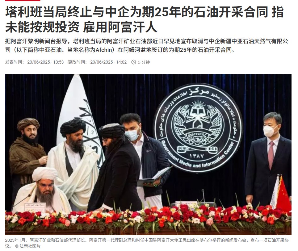 6月20日,法广报道。阿富汗塔利班近日宣布取消与中国新疆中亚石油天然气有限公司签订的为期25年的石油开采合同。