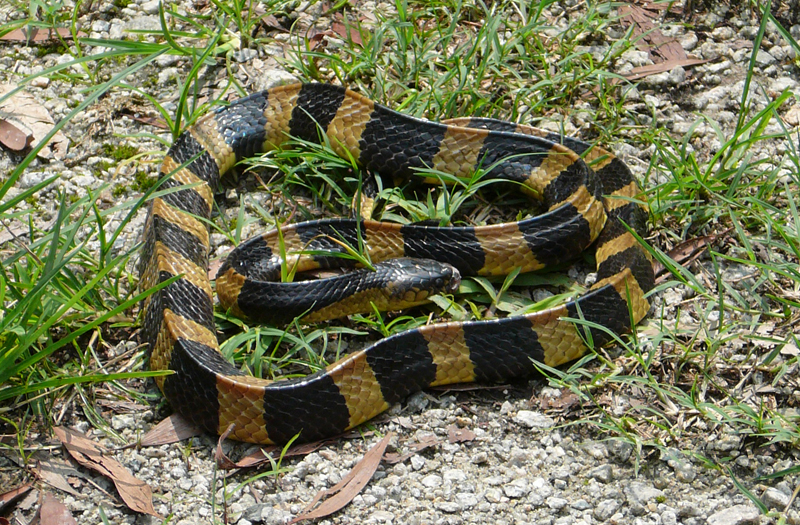 2021年,在美国一号公路,驾车旅行,突然内急,就停车路边,走进草丛,这里几百里没人烟,甚至连一辆车也很难见到。刚站住,想要小便,突然看到脚前半米处,窝着这么一个家伙……魂飞魄散,赶紧慢慢退远。到了有信号的地方,用手机一查,金环蛇啊,剧毒。若咬一口,吾命休矣!