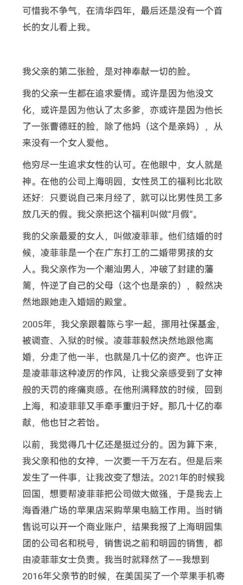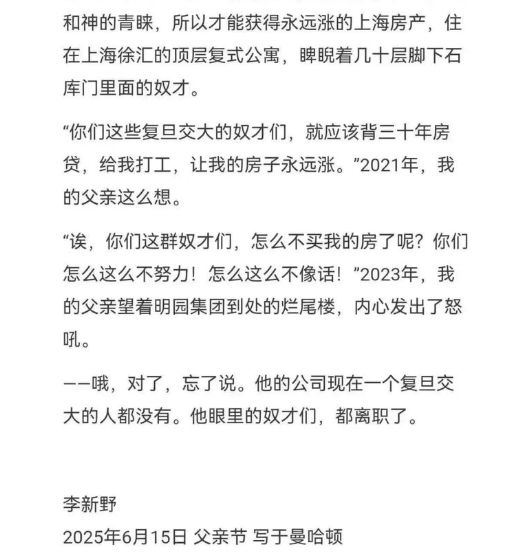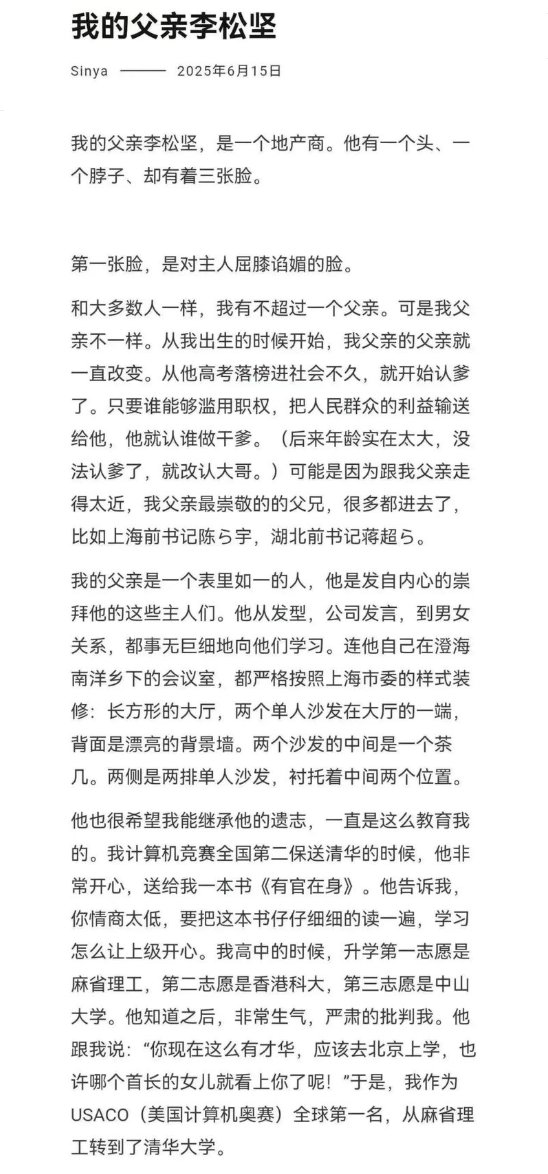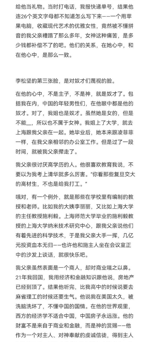 清华学霸手撕潮汕系地产大亨亲爹6月19日,一则名为《我的父亲李松坚》的公开信引发网友热议。信中直指其父亲四处“认爹”,其中包括原上海市委书记陈良宇等。还涉及家庭情感、财富分配不均以及家族企业经营理念分歧等敏感问题。更是声称其父亲“终其一生希望获得女性的认可”“视全中国的年轻男性为奴才”。